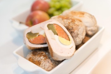 Maso nakrájíme napříč vláken na 4 stejnoměrné plátky. Plátky dáme na prkýnko a naklepáme paličkou, aby zvětšily svoji plochu. Vejce rozčtvrtíme. Klobásu, špek a okurky nakrájíme na proužky, tak aby byli o něco kratší než plátky masa. Maso osolíme, opepříme a potřeme lžicí hořčice. Na kraj plátku naskládáme okurku, klobásu, špek a na ně dáme vejce. Začneme rolovat maso od náplně. Okraje po stranách zahneme dovnitř. Po každém rolování maso utáhneme. Všechny závitky zabalíme a převážeme provázkem nebo spíchneme párátkem.